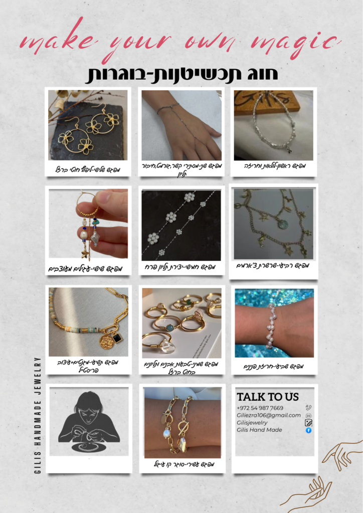 Gills Workshops הוא מקום לחוויית יצירה אמיתית דרך תכשיטים בעבודת יד. אני מעבירה סדנאות וחוגי תכשיטנות לקבוצות, אירועים ומסגרות שונות בכל רחבי הארץ – באווירה נעימה, מקצועית ומלאת השראה. כל משתתפ/ת יוצאת עם תכשיט אישי שהיא יצרה בעצמה, ניתן להזמין סדנאות עם וללא הגבלת תוצרים. הדגש שלי הוא על התאמה לקהל (גיל/סגנון/מטרה), הדרכה ברורה, וחוויה שמחברת בין אנשים ומשאירה מזכרת אמיתית שתמיד תשאו עליכם.